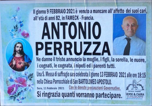 Il giorno 9 Febbraio 2021 è venuto a mancare, all’età di 82 anni, Antonio Perruzza. Una S. Messa di suffragio sarà celebrata il giorno 13 Febbraio alle ore 18:15 nella Chiesa Parrocchiale San Bartolomeo Apostolo. Alla famiglia le condoglianze di Sora24.