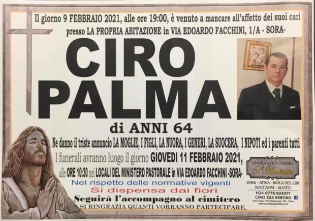 Il giorno 09 Febbraio 2021, alle ore 19:00, è venuto a mancare all’affetto dei suoi cari Ciro Palma, di anni 64. I funerali avranno luogo Giovedì 11 Febbraio presso i Locali del Ministero Pastorale di via Edoardo Facchini (San Giuliano). Alla moglie, i figli, la nuora, i generi, la suocera, i nipoti e i parenti tutti, le condoglianze di Sora24.