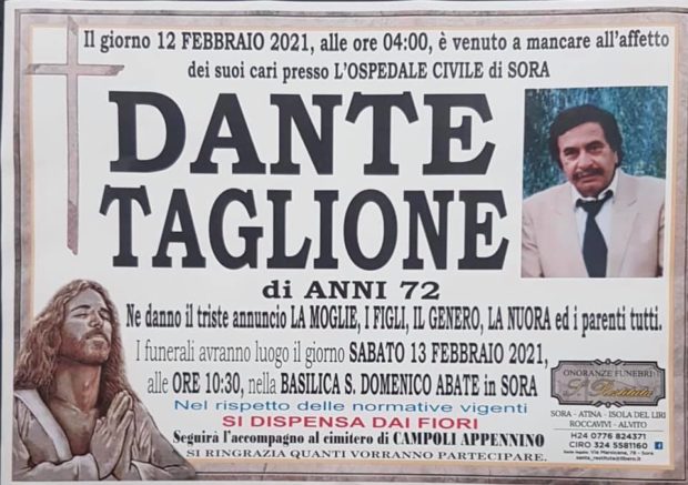 Il giorno 12 Febbraio 2021, alle ore 4:00, è venuto a mancare all’affetto dei suoi cari Dante Taglione, di anni 72. I funerali avranno luogo Sabato 13 alle 10:30 nella Basilica San Domenico Abate. Alla moglie, i figli, il genero, la nuora e i parenti tutti, le condoglianze di Sora24.