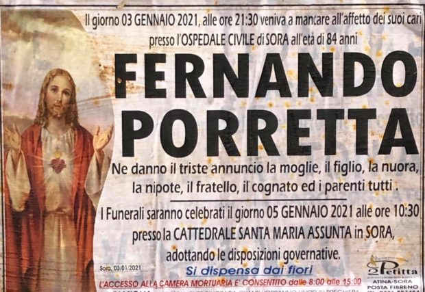 Il giorno 03 Gennaio 2021, alle ore 21:30, è venuto a mancare all’affetto dei suoi cari, all’età di 84 anni, Fernando Porretta. I funerali sono stati celebrati oggi nella Cattedrale di Sora. Alla moglie, il figlio, la nuora, la nipote, il fratello, il cognato ed i parenti tutti, le condoglianze di Sora24.