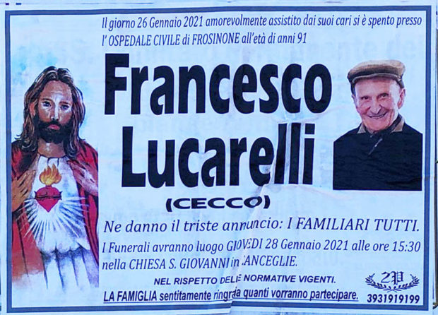 Il giorno 26 Gennaio 2021 è venuto a mancare, all’età di 91 anni, Francesco Lucarelli (Cecco). I funerali avranno luogo Giovedì 28 Gennaio alle 15:30 a San Giovanni Battista (Cancéglie).