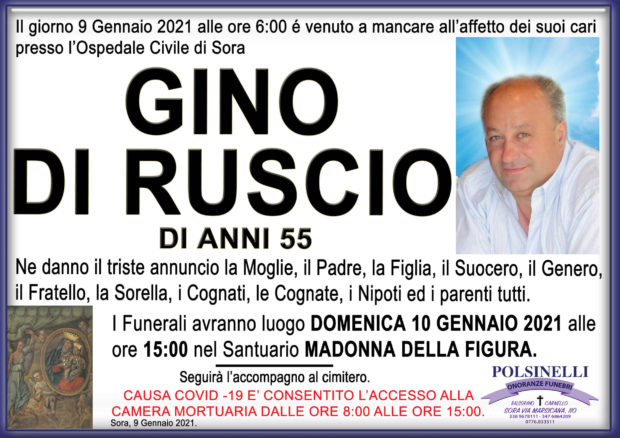 Il giorno 9 Gennaio 2021 alle ore 6:00 è venuto a mancare all’affetto dei suoi cari Gino Di Ruscio. I funerali avranno luogo Domenica 10 Gennaio 2021 alle 15:00 presso il Santuario della Figura. Alla moglie, il padre, la figlia, il suocero, il genero, il fratello, la sorella, i cognati, le cognate, i nipoti ed i parenti tutti, le condoglianze di Sora24.