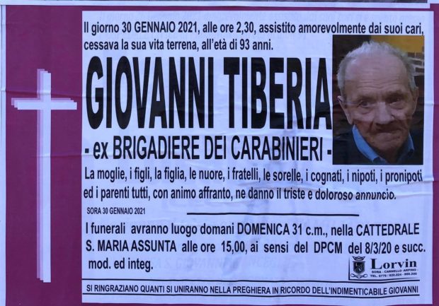 Il giorno 30 Gennaio 2021, alle ore 2:30, è venuto a mancare all’età di 93 anni, Giuseppe Tiberia, ex Brigadiere dei Carabinieri. I funerali si sono svolti oggi pomeriggio in Cattedrale. Alla moglie, i figli, la figlia, le nuore, i fratelli, le sorelle, i cognati, i nipoti, i pronipoti e i parenti tutti, le condoglianze di Sora24.