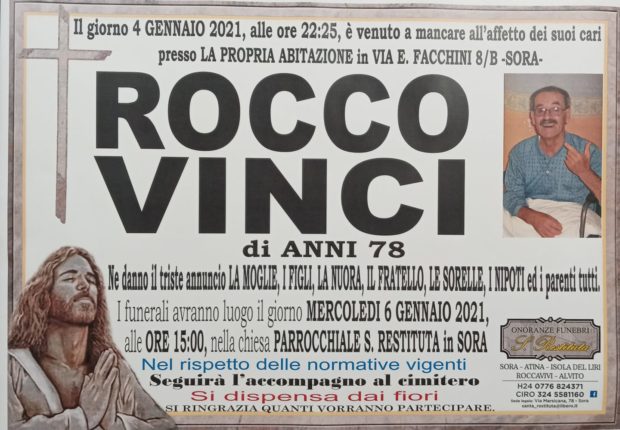 Il giorno 4 Gennaio 2021, alle ore 22:25, è venuto a mancare all’affetto dei suoi cari Rocco Vinci, di anni 78. I funerali si sono svolti oggi pomeriggio a Santa Restituta. Alla moglie, i figli, la nuora, il fratello, le sorelle, i nipoti ed i parenti tutti, le condoglianze di Sora24.