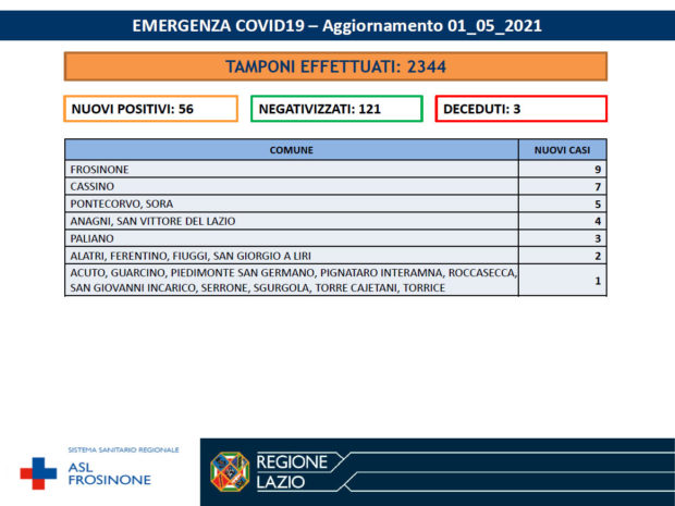 La Asl Frosinone ha diffuso i numeri aggiornati al 1° Maggio 2021, per ciò che riguarda l’emergenza Covid-19. I tamponi effettuati sono stati 2.037 I nuovi positivi sono 56, i negativizzati 121, i deceduti (residenti provincia di Frosinone) 3.