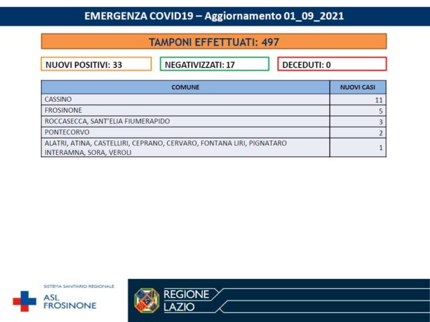 La Asl Frosinone ha diffuso i numeri aggiornati al 1° Settembre 2021, per ciò che riguarda l’emergenza Covid-19. I tamponi effettuati sono stati 497 I nuovi positivi sono 33, i negativizzati 17 i deceduti (residenti provincia di Frosinone) 0.