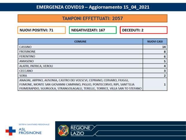 La Asl Frosinone ha diffuso i numeri aggiornati al 15 Aprile 2021, per ciò che riguarda l’emergenza Covid-19. I tamponi effettuati sono stati 2.057. I nuovi positivi sono 71, i negativizzati 167, i deceduti (residenti provincia di Frosinone) 2. Di seguito i dati di tutti i comuni.
