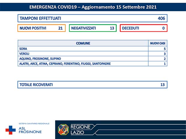 La Asl Frosinone ha diffuso i numeri aggiornati all’11 Settembre 2021, per ciò che riguarda l’emergenza Covid-19. I tamponi effettuati sono stati 380 I nuovi positivi sono 17, i negativizzati 43 i deceduti (residenti provincia di Frosinone) 0.