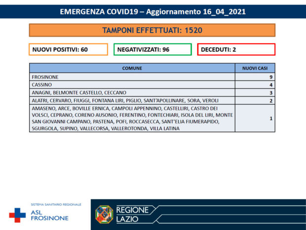La Asl Frosinone ha diffuso i numeri aggiornati al 16 Aprile 2021, per ciò che riguarda l’emergenza Covid-19. I tamponi effettuati sono stati 1.520. I nuovi positivi sono 60, i negativizzati 96, i deceduti (residenti provincia di Frosinone) 2. Di seguito i dati di tutti i comuni.