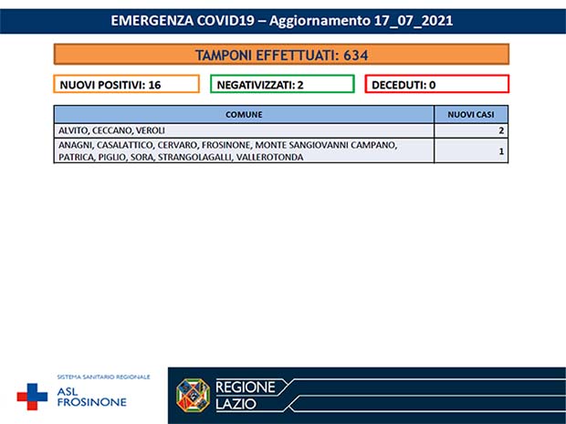 La Asl Frosinone ha diffuso i numeri aggiornati al 17 Luglio 2021, per ciò che riguarda l’emergenza Covid-19. I tamponi effettuati sono stati 634 I nuovi positivi sono 16, i negativizzati 2 i deceduti (residenti provincia di Frosinone) 0.