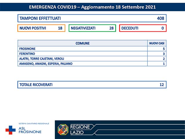 La Asl Frosinone ha diffuso i numeri aggiornati all’11 Settembre 2021, per ciò che riguarda l’emergenza Covid-19. I tamponi effettuati sono stati 380 I nuovi positivi sono 17, i negativizzati 43 i deceduti (residenti provincia di Frosinone) 0.
