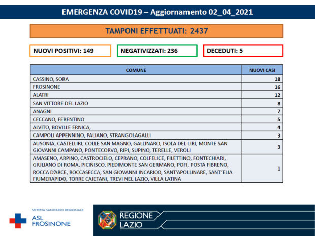 La Asl Frosinone ha diffuso i numeri aggiornati al 2 Aprile 2021, per ciò che riguarda l’emergenza Covid-19. I tamponi effettuati sono stati 2.437. I nuovi positivi sono 149, i negativizzati 236 i deceduti (residenti provincia di Frosinone) 5. Di seguito i dati di tutti i comuni.