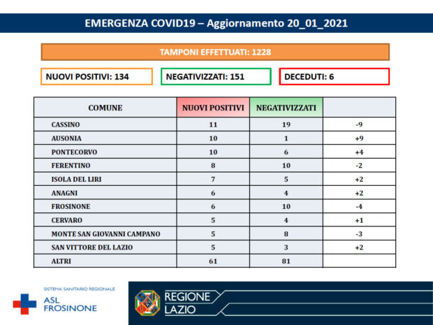 La Asl Frosinone ha diffuso i numeri aggiornati al 20 Gennaio 2021, per ciò che riguarda l’emergenza Covid-19. I tamponi effettuati sono stati 1.228 I nuovi positivi sono 134, i negativizzati 151, i deceduti 6. Di seguito i dati dei comuni di Cassino, Ausonia, Pontecorvo, Ferentino, Isola del Liri, Anagni, Frosinone, Cervaro, Monte San Giovanni Campano, San Vittore del Lazio, Altri.