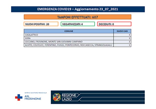 La Asl Frosinone ha diffuso i numeri aggiornati al 23 Luglio 2021, per ciò che riguarda l’emergenza Covid-19. I tamponi effettuati sono stati 607 I nuovi positivi sono 20, i negativizzati 4 i deceduti (residenti provincia di Frosinone) 0.