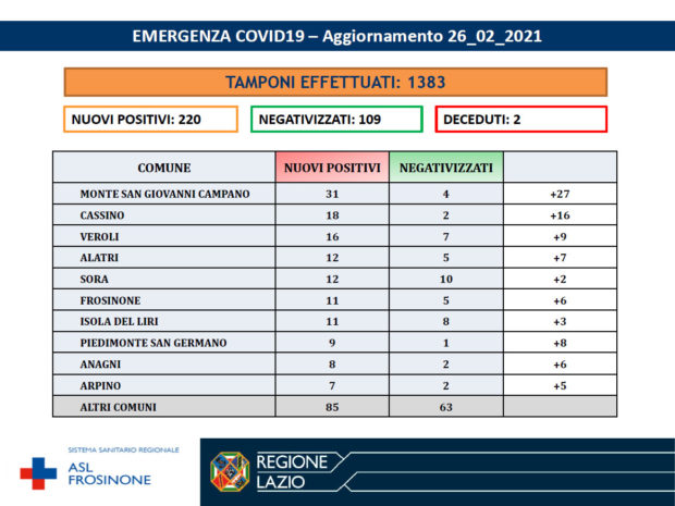 La Asl Frosinone ha diffuso i numeri aggiornati al 26 Febbraio 2021, per ciò che riguarda l’emergenza Covid-19. I tamponi effettuati sono stati 1.383. I nuovi positivi sono 220, i negativizzati 109, i deceduti (residenti provincia di Frosinone) 2. Di seguito i dati dei comuni di Monte San Giovanni Campano, Cassino, Veroli, Alatri, Sora, Frosinone, Isola del Liri, Piedimonte San Germano, Cassino, Anagni, Arpino, altri Comuni.