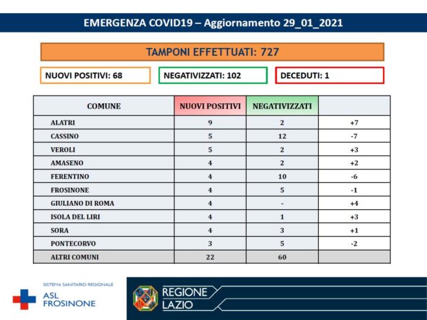 La Asl Frosinone ha diffuso i numeri aggiornati al 29 Gennaio 2021, per ciò che riguarda l’emergenza Covid-19. I tamponi effettuati sono stati 727. I nuovi positivi sono 68, i negativizzati 102, i deceduti 1. Di seguito i dati dei comuni di Alatri, Cassino, Veroli, Amaseno, Ferentino, Frosinone, Giuliano di Roma, Isola del Liri, Sora, Pontecorvo, altri Comuni.