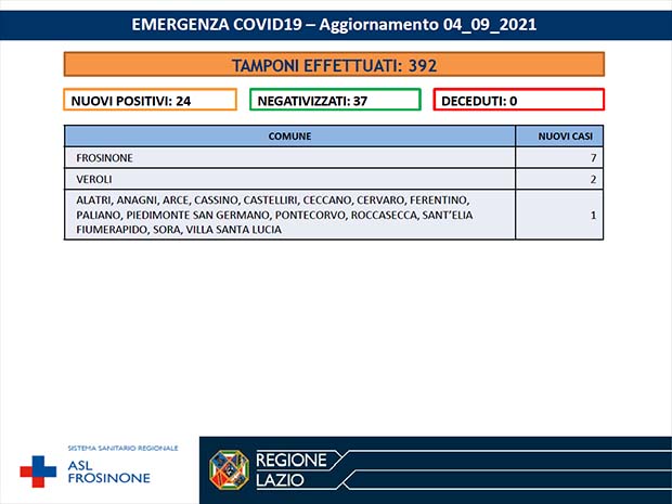 La Asl Frosinone ha diffuso i numeri aggiornati al 4 Settembre 2021, per ciò che riguarda l’emergenza Covid-19. I tamponi effettuati sono stati 392 I nuovi positivi sono 24, i negativizzati 37 i deceduti (residenti provincia di Frosinone) 0.