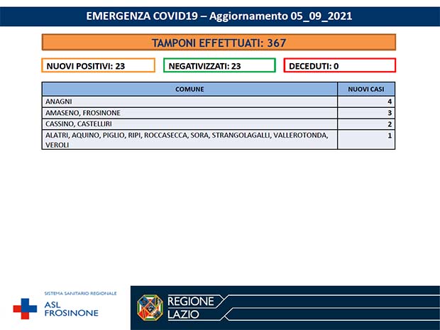 La Asl Frosinone ha diffuso i numeri aggiornati al 5 Settembre 2021, per ciò che riguarda l’emergenza Covid-19. I tamponi effettuati sono stati 367 I nuovi positivi sono 23, i negativizzati 23 i deceduti (residenti provincia di Frosinone) 0.