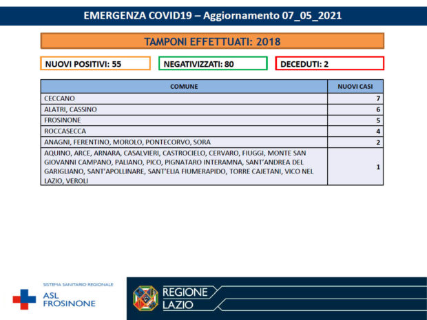 La Asl Frosinone ha diffuso i numeri aggiornati al 7 Maggio 2021, per ciò che riguarda l’emergenza Covid-19. I tamponi effettuati sono stati 2.018 I nuovi positivi sono 55, i negativizzati 80, i deceduti (residenti provincia di Frosinone) 2.