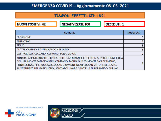 La Asl Frosinone ha diffuso i numeri aggiornati all’8 Maggio 2021, per ciò che riguarda l’emergenza Covid-19. I tamponi effettuati sono stati 1.891 I nuovi positivi sono 62, i negativizzati 100, i deceduti (residenti provincia di Frosinone) 1.