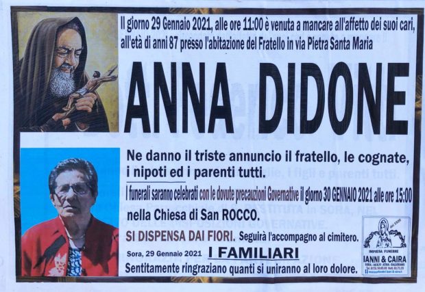 Il giorno 29 Gennaio 2021, alle ore 11:00, è venuta a mancare all’affetto dei suoi cari, all’età di 87 anni, Anna Didone. I funerali si sono svolti oggi pomeriggio a San Rocco. Al fratello, le cognate e i parenti tutti, le condoglianze di Sora24.