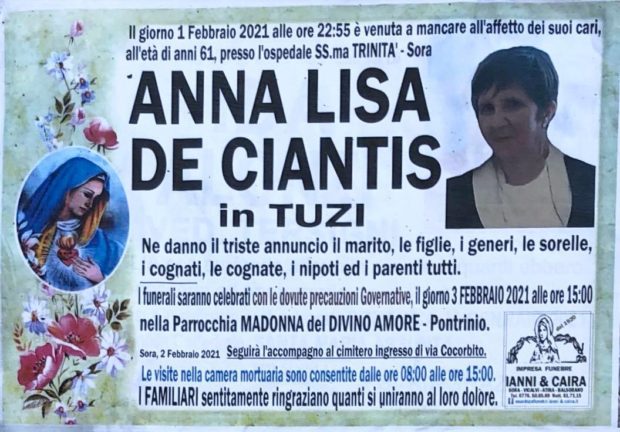 Il giorno 1° Febbraio 2021, alle ore 22:55, è venuta a mancare all’affetto dei suoi cari Anna Lisa De Ciantis, in Tuzi. I funerali avranno luogo oggi pomeriggio alle 15:00 nella Chiesa Madonna del Divino Amore (Pontrinio). Al marito, le figlie, i generi, le sorelle, i cognati, le cognate, i nipoti e i parenti tutti, le condoglianze di Sora24.
