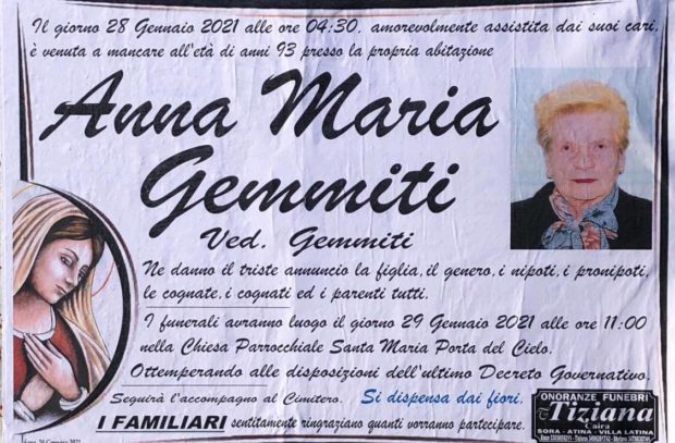 Il giorno 28 Gennaio 2021, alle ore 4:30, è venuta a mancare, all’età di 93 anni, Anna Maria Gemmiti, vedova Gemmiti. I funerali avranno luogo il 29 Gennaio alle 11:00 nella chiesa S. Maria Porta del Cielo. Alla figlia, il genero, i nipoti, i pronipoti, le cognate, i cognati e i parenti tutti, le condoglianze di Sora24.
