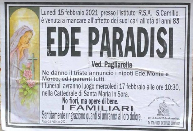 Il giorno 15 Febbraio 2021 è venuta a mancare all’affetto dei suoi cari, all’età di 83 anni, Ede Paradisi, vedova Pagliarella. I funerali si sono svolti stamani in Cattedrale. Ai nipoti Ede, Monia e Marco, e i parenti tutti, le condoglianze di Sora24.