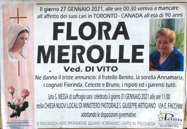 Il giorno 27 Gennaio 2021, alle ore 00:30, è venuta a mancare all’affetto dei suoi cari, all’età di 90 anni, Flora Merolle, vedova Di Vito. Una S. Messa di suffragio sarà celebrata il 31 Gennaio alle ore 11:00 nella chiesa di via Edoardo Facchini a San Giuliano. Al fratello Benito, la sorella Annamaria, i cognati Florinda, Celeste e Bruno, i nipoti ed i parenti tutti, le condoglianze di Sora24.