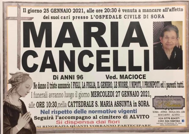 Il giorno 25 Gennaio 2021 alle ore 20:30 è venuta a mancare Maria Cancelli, vedova Macioce, di anni 96. I funerali avranno luogo Mercoledì 27 Gennaio in Cattedrale alle ore 10:30. Ai figli, la figlia, il genero, le nuore, i nipoti, i pronipoti e i parenti tutti le condoglianze di Sora24.