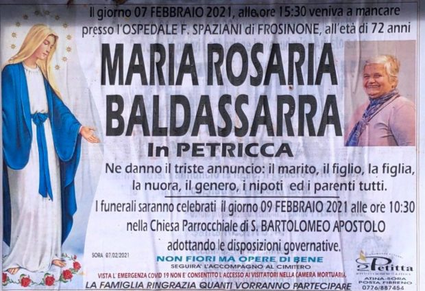 Il giorno 07 Febbraio 2021, alle ore 15:30, è venuta a mancare, all’età di 72 anni, Maria Rosaria Baldassarra, in Petricca. I funerali avranno luogo il 9 Febbraio alle ore 10:30 nella Chiesa Parrocchiale San Bartolomeo Apostolo. Al marito, il figlio, la figlia, la nuora, il genero, i nipoti e i parenti tutti, le condoglianze di Sora24.