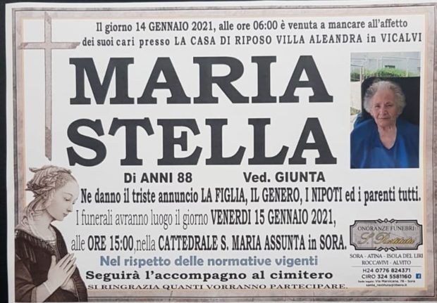 Il giorno 14 Gennaio 2021, alle ore 6:00, è venuta a mancare all’affetto dei suoi cari Maria Stella, vedova Giunta, di anni 88. I funerali sono stati celebrati oggi in Cattedrale a Sora. Alla figlia, il genero, i nipoti ed i parenti tutti, le condoglianze di Sora24.