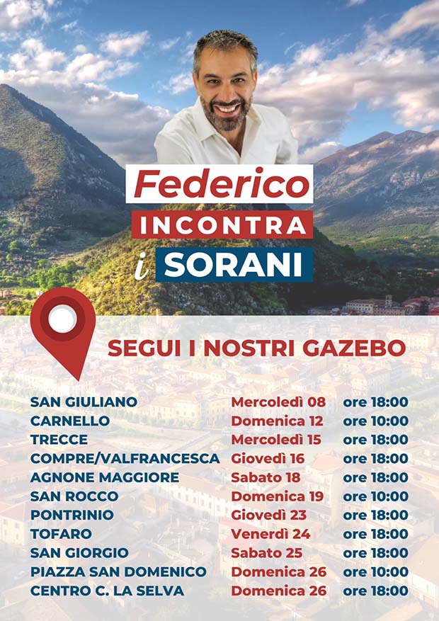 Nasce l’iniziativa “Federico incontra i Sorani“, una serie di incontri nei quartieri della nostra città che si svolgeranno nel mese di settembre in vista delle prossime elezioni Amministrative del 3 e 4 ottobre e che vedranno i cittadini Sorani protagonisti.
