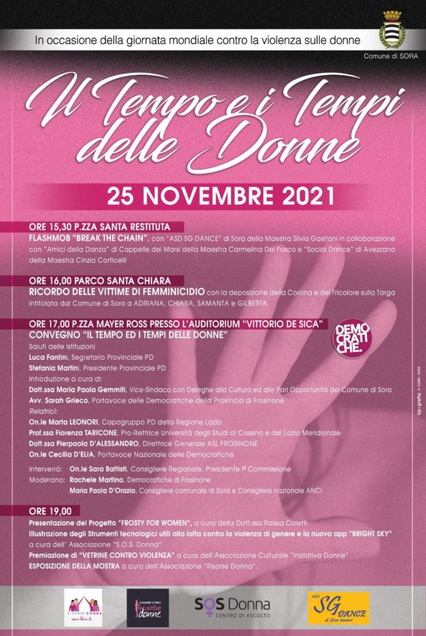 È il Vice Sindaco Maria Paola Gemmiti, delegata alla Cultura e alle Pari Opportunità ad illustrare l’evento: “Abbiamo organizzato un articolato programma di grande spessore sociale e culturale che, nella giornata del 25 novembre, coinvolgerà numerose associazioni, scuole di danza e personalità femminili di rilievo. Ringrazio tutte le realtà coinvolte per avere risposto con slancio all’invito del Comune di Sora. Vogliamo focalizzare l’attenzione sull’importanza della promozione della cultura della parità di genere e della non violenza. Anno dopo anno, invece di migliorare, la situazione delle donne in Italia e nel mondo diviene sempre più drammatica. Purtroppo anche la nostra città è stata più volte duramente colpita da fenomeni di femminicidio e porta nel cuore le sue vittime innocenti: Samanta Fava, Chiara Sacco, Gilberta Palleschi e Adriana Tamburrini. Dobbiamo partire dal commosso ricordo delle nostre concittadine e fare rete, insieme, per una riflessione collettiva e feconda sul tema della violenza. Come donne e come amministratrici, l’invito che parte da Sora è quello di impegnarci ad agire per cambiare la cultura di genere, in particolare rivolgendoci anche alle giovani generazioni”.