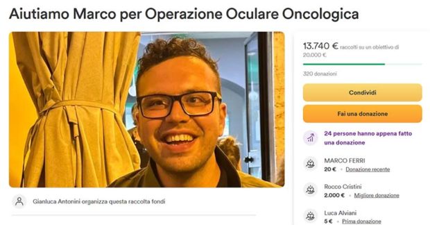 «Ciao a tutti, Vi presento Marco, un uomo coraggioso che sta affrontando una sfida molto difficile: una operazione oculare oncologica. Marco è un amico, un membro della nostra comunità e una persona amata da tutti coloro che lo conoscono. Oggi vogliamo unirci per supportarlo nel suo percorso di guarigione.