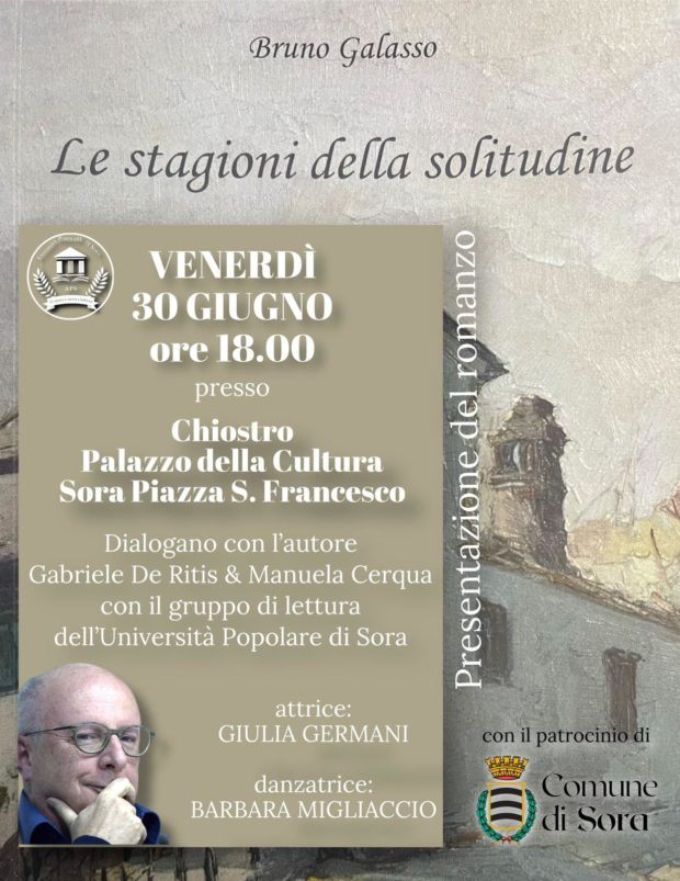 Venerdì 30 giugno, presso il Chiostro del Palazzo della Cultura di Sora (ingresso Biblioteca Comunale – piazza S. Francesco), alle ore 18.00 Gabriele De Ritis e Manuela Cerqua, con tutto il gruppo di lettura dell’Università Popolare di Sora dialogheranno con Bruno Galasso, autore del romanzo dal titolo: “Le stagioni della solitudine“.