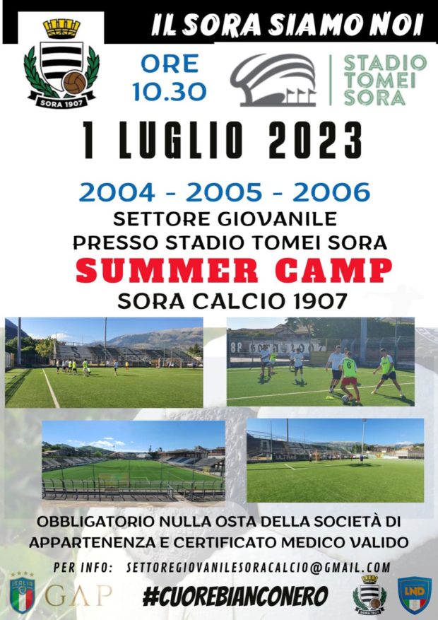 Sabato 1° Luglio 2023, allo stadio “Claudio Tomei”, si terrà uno stage del Sora Calcio riservato ai ragazzi 2004-2005-2006.