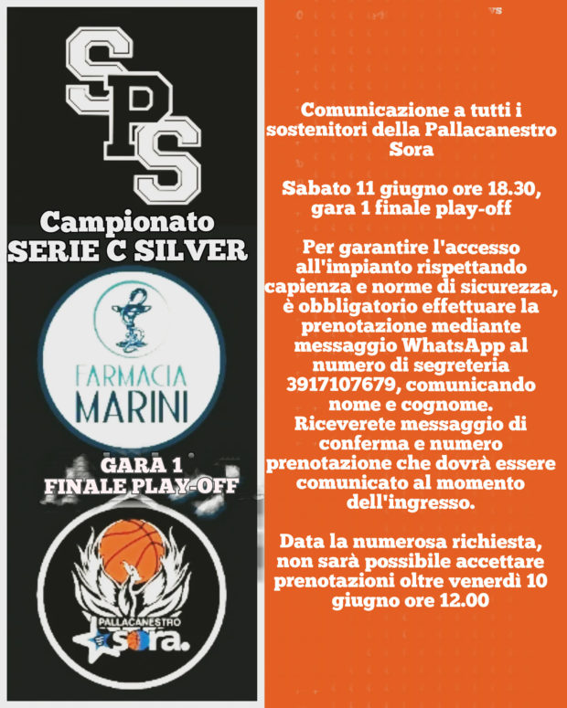 La Gara 1 della Finale Playoff Serie C Silver, Pallacanestro Sora vs Basket Cassino, si giocherà Sabato 11 Giugno con inizio alle ore 18:30 presso il PalaDiPoce (pallone tensostatico, via Sferracavallo).