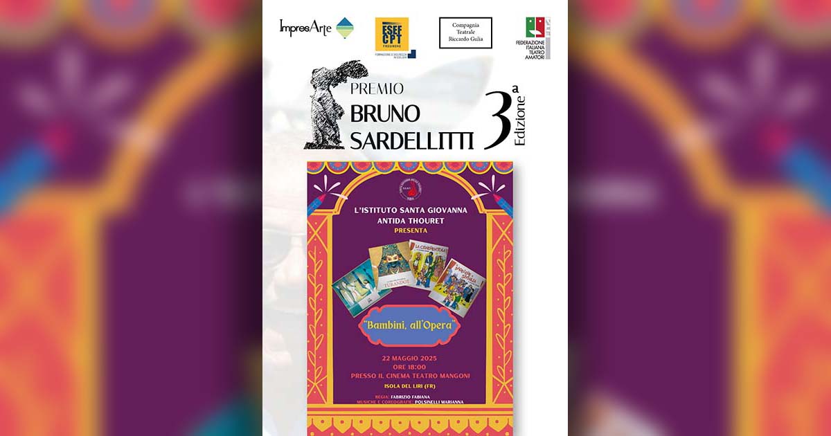 Giovedì 22 maggio alle ore 18 il cinemateatro Mangoni di Isola del Liri ospiterà il secondo appuntamento del Premio Teatrale “Bruno Sardellitti” 2025. In scena gli alunni dell’Istituto Santa Giovanna Antida Thouret, protagonisti dello spettacolo “Bambini all’opera”. La regia è firmata da Fabrizio Fabiana, con musiche e coreografie curate da Marianna Polsinelli.