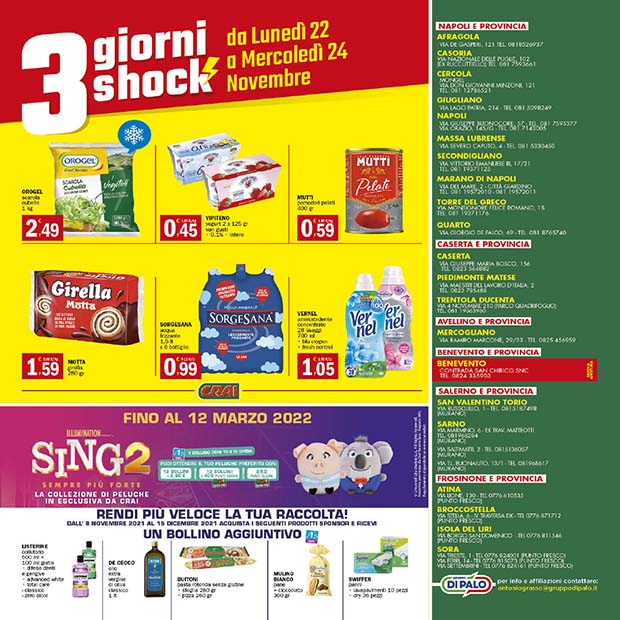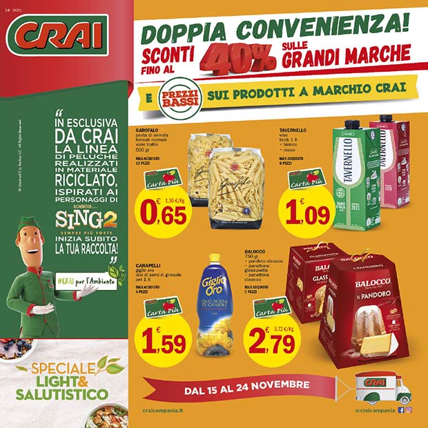 Vi ricordiamo, come sempre, di dare un’occhiata anche ai prezzi costantemente bassi sui prodotti a marchio CRAI, proposti grazie alla partnership con l’omonimo grande gruppo nazionale, e all’ultima pagina dedicata ai tre giorni shock, questa volta in programma dal 22 al 24 Novembre 2021! Di seguito le venti pagine del nuovo volantino.