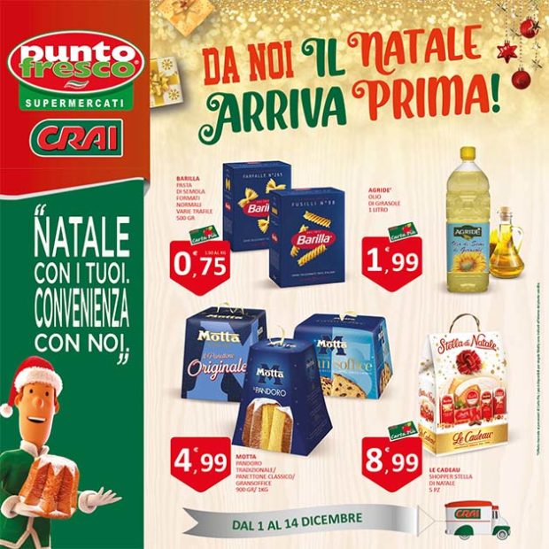 Da Punto Fresco CRAI “Il Natale arriva prima!”. Per voi tante nuove opportunità dal 1° al 14 Dicembre 2022. Sfogliate il volantino linkato di seguito e poi, se volete, fate la vostra lista: vi aspettiamo in tutti i supemercati della catena. Ricordate sempre di portare con voi la “Carta Più“, in quanto diversi prodotti prevedono l’applicazione dello sconto indicato solo se in cassa si presenta la carta stessa.