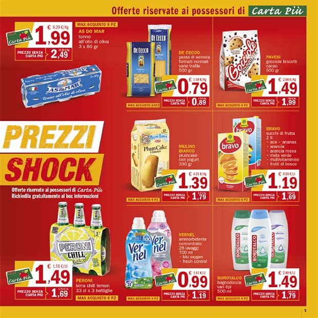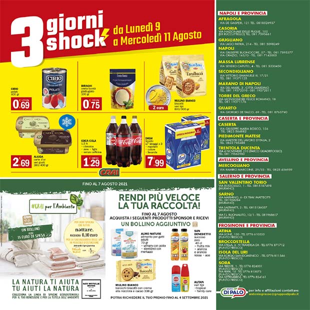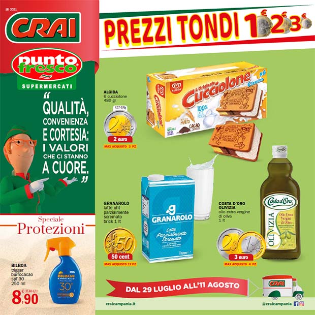 Vi ricordiamo, come sempre, di dare un’occhiata anche ai prezzi costantemente bassi sui prodotti a marchio CRAI, proposti grazie alla partnership con l’omonimo grande gruppo nazionale, e all’ultima pagina dedicata ai tre giorni shock, questa volta in programma dal 09 all’11 Agosto! Di seguito le venti pagine del nuovo volantino.