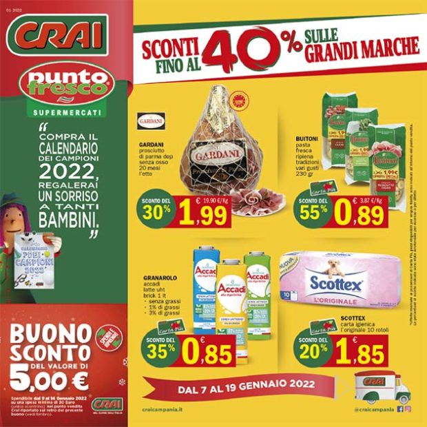 Con PUNTO FRESCO il 2022 inizia alla grande: Sconti fino al 40% sulle grandi marche. I “supermercati di casa nostra” iniziano il nuovo anno con tante interessanti offerte, a cominciare dai prodotti riportati sulla copertina del nuovo volantino: