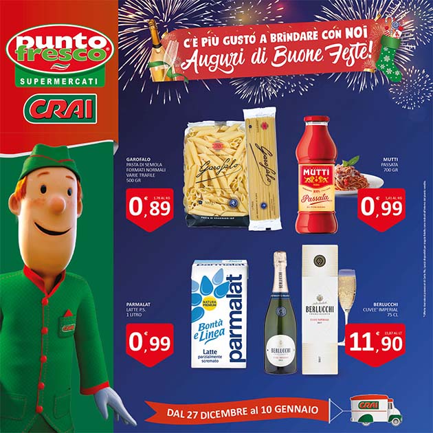 C’è più gusto a brindare con Punto Fresco! È in vigore la nuova promo dei supermercati Punto Fresco CRAI, l’ultima del 2022 e nel contempo la prima del 2023. Per voi tante nuove opportunità dal 27 Dicembre 2022 al 10 Gennaio 2023. Sfogliate il volantino linkato qui e poi, se volete, fate la vostra lista: vi aspettiamo in tutti i supemercati della catena. Ricordate sempre di portare con voi la “Carta Più“, in quanto diversi prodotti prevedono l’applicazione dello sconto indicato solo se in cassa si presenta la carta stessa.