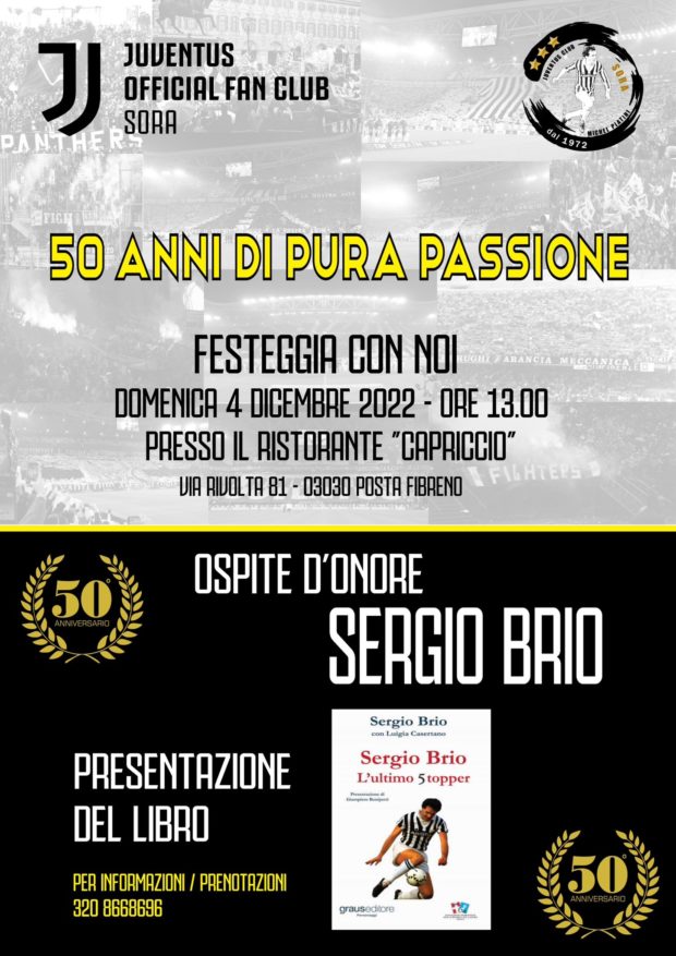 Lo Juventus Official Fan Club Sora, in occasione del 50° anno del club, organizza il pranzo natalizio il giorno 4/12/2022 presso il ristorante Capriccio di Posta Fibreno.