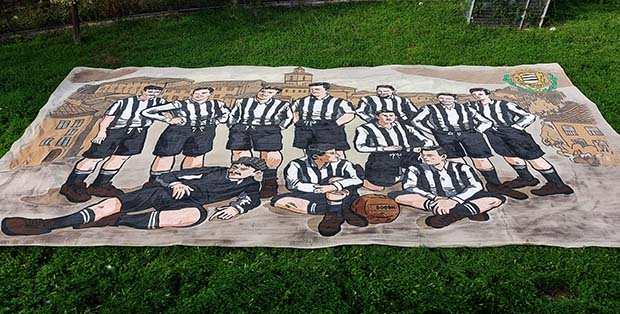 18 x 10 metri di stoffa dipinti interamente a mano e raffiguranti una nota locandina del 1908 contenente l’annuncio di un’imminente “disfida” di football in programma il giorno dell’Assunta contro una rappresentanza della Valle di Comino sul campo di “Piazza Nova”.