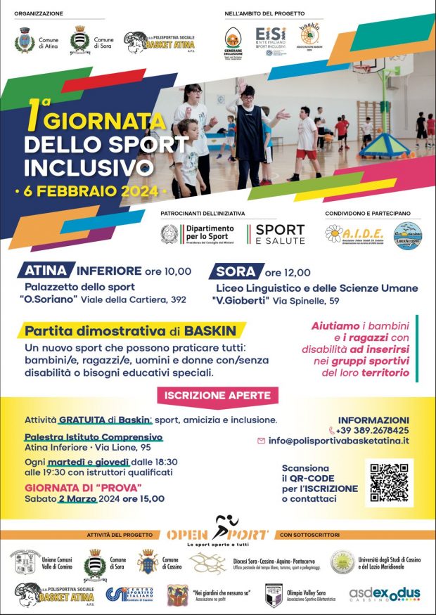 Tutto pronto per la 1ª Giornata dello Sport inclusivo in programma, a Sora ed a Atina, martedì 6 febbraio 2024. L’iniziativa rientra in “Open Sport – Lo sport aperto a tutti”, il progetto sostenuto dal Comune di Sora e rivolto ai bambini e ragazzi con disabilità per favorirne l’inserimento nei gruppi sportivi del loro territorio.