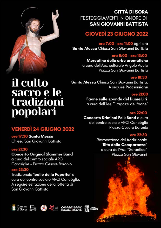 “Il culto sacro e le tradizioni popolari”: è questo il tema dei festeggiamenti in onore di San Giovanni Battista che si terranno a Sora giovedì 23 e venerdì 24 giugno 2022.