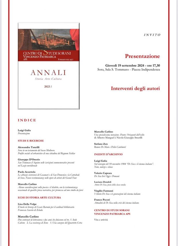 Nuovo appuntamento del Centro Studi sorani “Vincenzo Patriarca”. Giovedì 19 settembre, alle ore 17,30, presso la Sala S. Tommaso, a Sora, in piazza Indipendenza, sarà presentato il primo numero di ANNALI Storia Arte Cultura 2023 con brevi interventi degli autori.