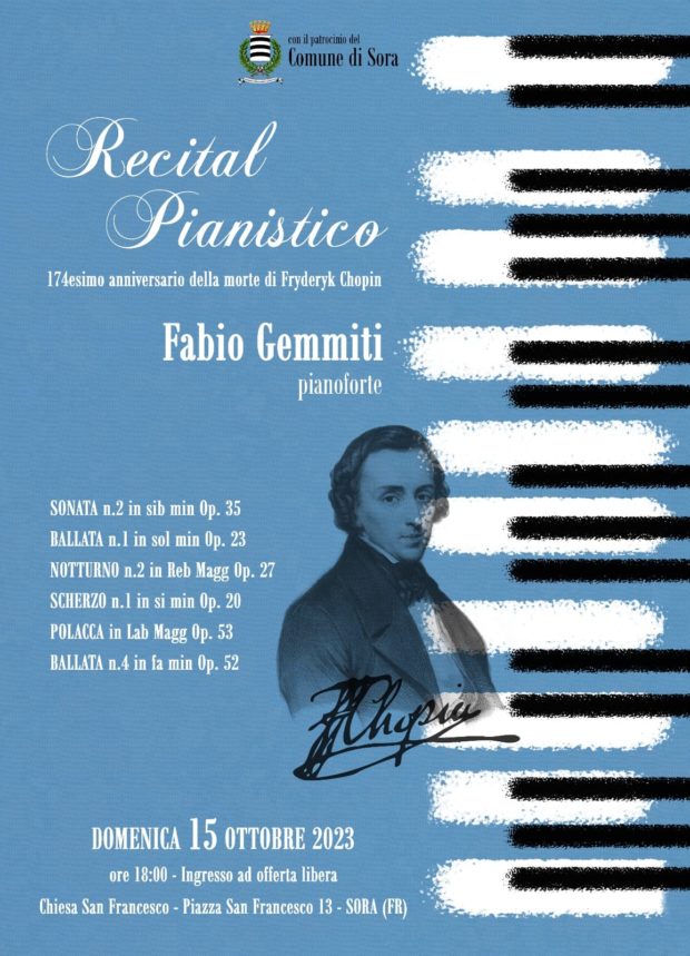Un recital di pianoforte interamente dedicato al genio compositivo di Chopin. Domenica 15 ottobre 2023, alle ore 18, nella Chiesa di San Francesco, protagonista di un nuovo appuntamento dell’Ottobre Sorano 2023 sarà il pianista Fabio Gemmiti che proporrà al pubblico un affascinante programma musicale.